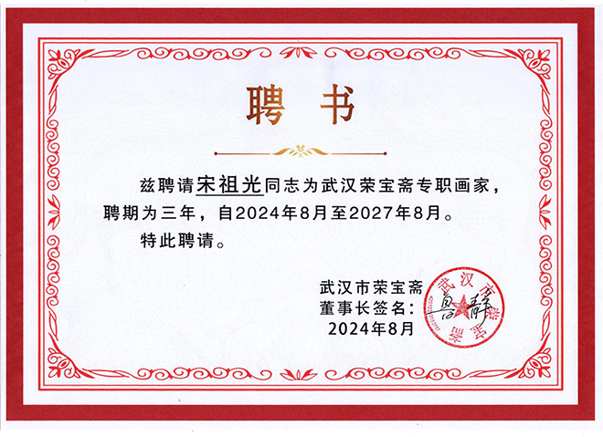 兹聘请宋祖光同志为武汉荣宝斋专职画家聘期为三年,
